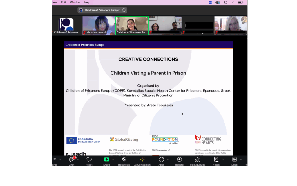 During the meeting, a video of a children’s visit showing the children’s own experiences in prison was screened, followed by presentations of good practices from abroad and Greece, including: